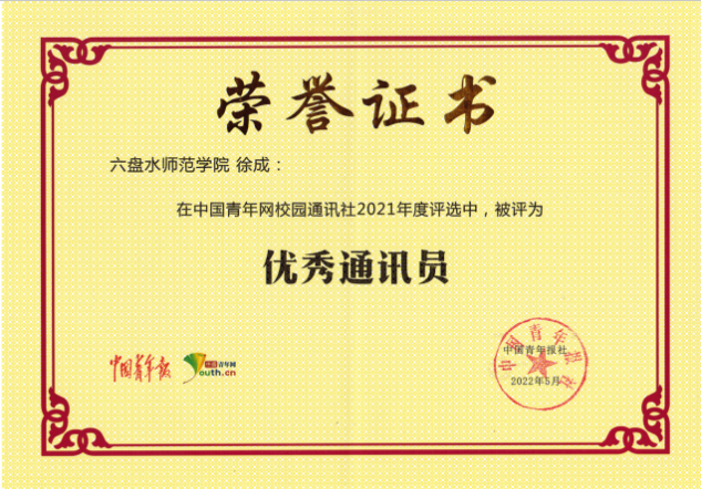 近日,我院新闻学2019级学生徐成在中国青年网举办的“中国青年网校园通讯社2021年度评选活动”中,被评为“优秀通讯员”。