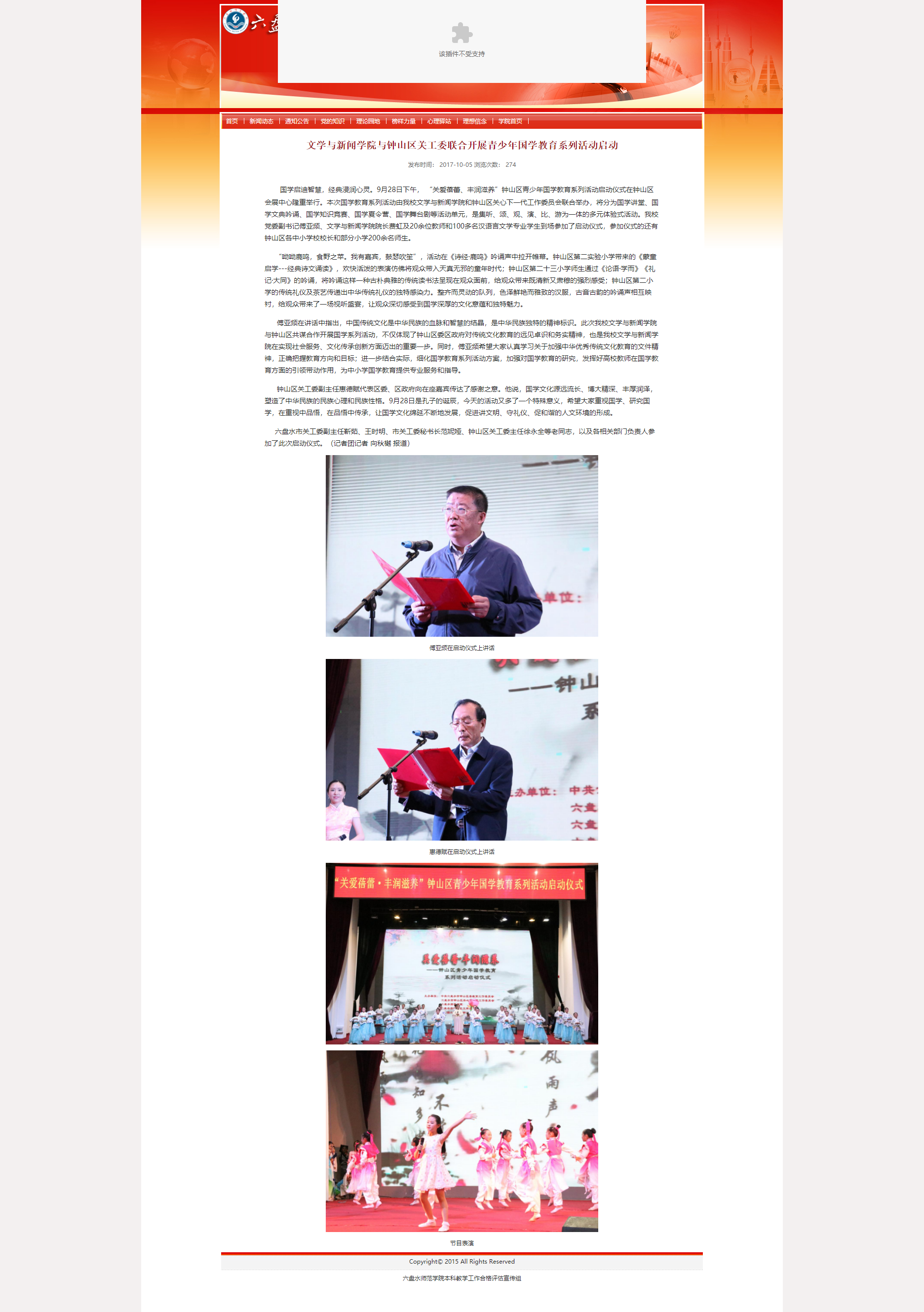 中心充分发挥省级“人文社科示范基地”的带头和引领工作,以期为中国凉都国学教育的研究、国学知识的宣传和普及提供经验借鉴,为贵州省人文社科工作的繁荣发展做出新的更大贡献。“中国凉都国学教育与研究中心”文化创新研究典型案例包括国学教育培训:传承传承国学经典;“自信与传承—— 经典精讲百堂课”:以文化人,润泽心灵;bat365在线中国登录入口“中华魂”“科技之路”浮雕墙:充分发挥文化育人、环境育人功能等,通过“中国凉都国学教育与研究中心”官网网站、中国教育在线、中国高校之窗、多彩贵州网、《六盘水日报》、多彩贵州网等国家级、省市级媒体平台进行宣传推广,在扩大中心知名度、美誉度、影响力的同时,使之成为精神文明建设、知识科普、社科研究、丰富群众精神文化活动和学术交流的重要载体。