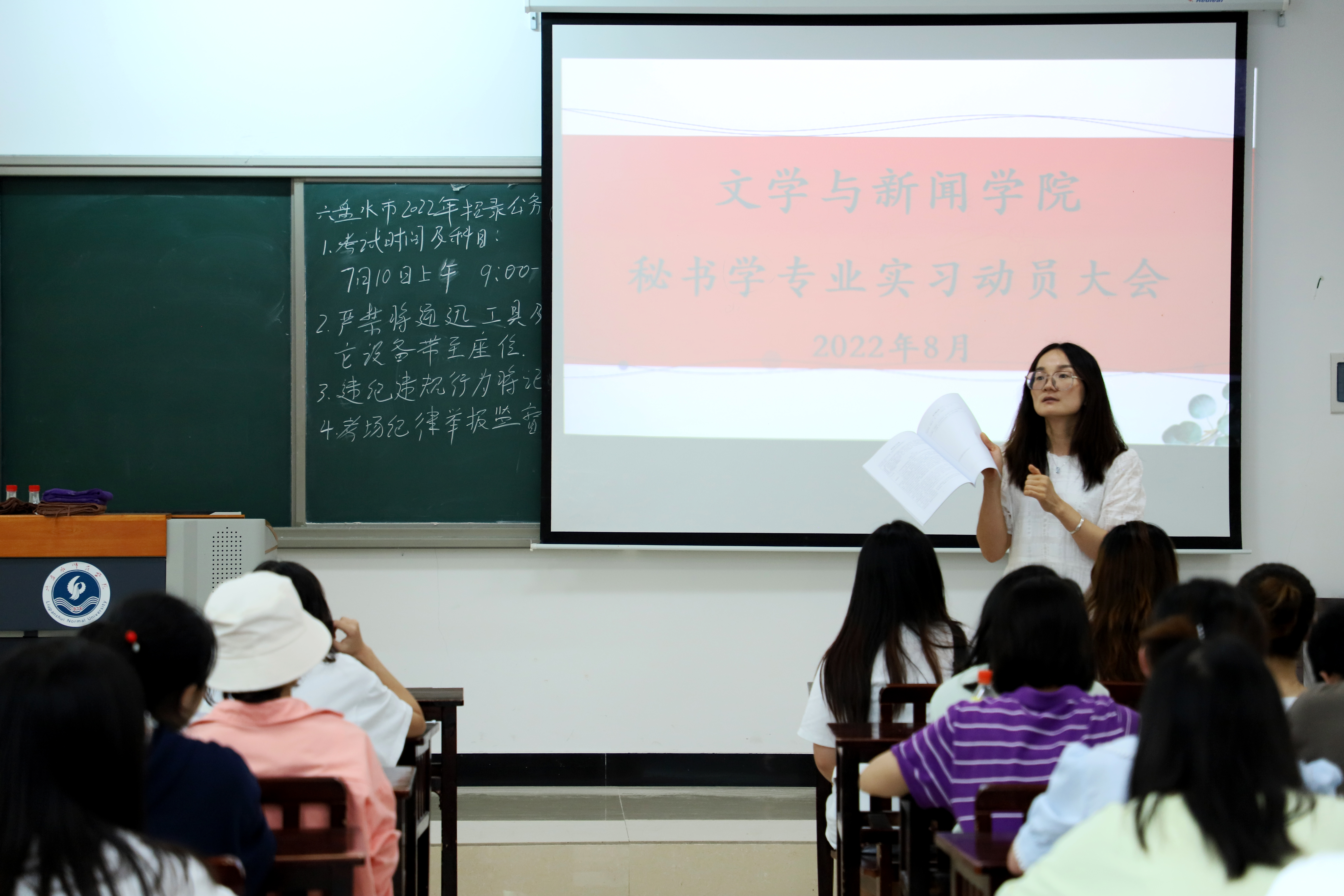 专业实习是提高学生专业实践技能的重要环节,也是专业教学活动的重要组成部分。为保证文学与新闻学院2019级秘书学专业学生实习任务的顺利完成,8月18日下午,文学与新闻学院在奥学楼106教室召开2019级秘书学专业实习动员大会。动员会由秘书学系主任田利红主持。