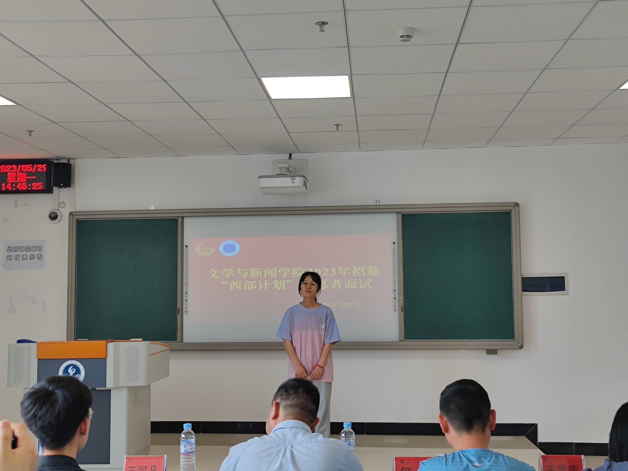 5月29日下午,文学与新闻学院在奥学楼617会议室举行2023年招募西部计划志愿者面试。学院党委副书记杜云、学生科(团委)副科长王可凡以及教师李娆宇、何亮、王雪雪、杨杰担任面试评委。