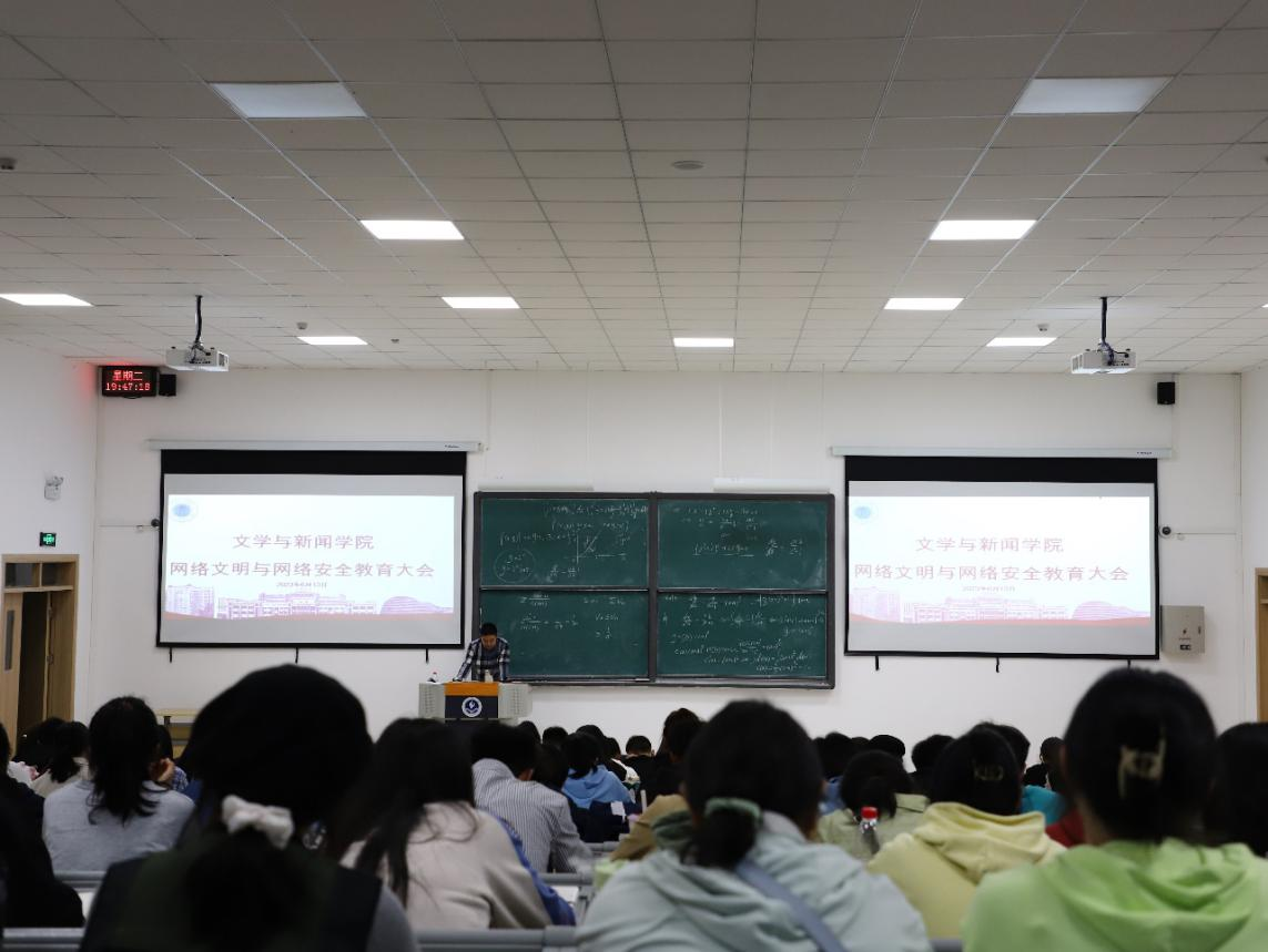 6月13日晚,文学与新闻学院在勤学楼208、311教室举行网络文明与网络安全教育大会。学院党委副书记杜云,学生科(团委)副科长(副书记)王可凡,教师李娆宇、廖小欢,辅导员王雪雪、杨杰出席。