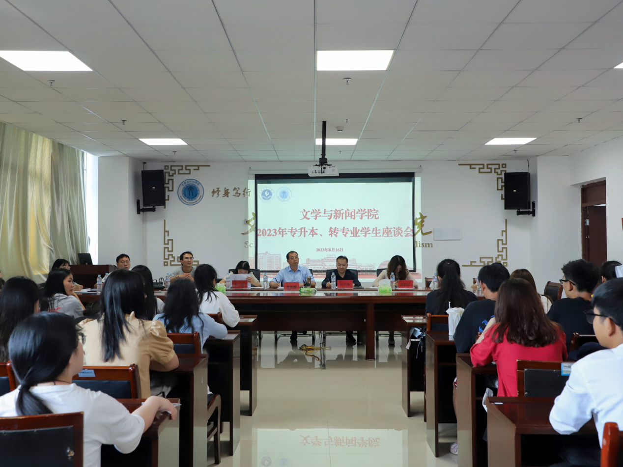 8月16日下午,文学与新闻学院在奥学楼617会议室召开2023年专升本、转专业学生座谈会。主持工作的副院长许兴阳教授,院长助理、新闻学系主任余索副教授,秘书学系主任田利红副教授,学院部分教师参加会议。会议由学院党委书记龙尚国主持。