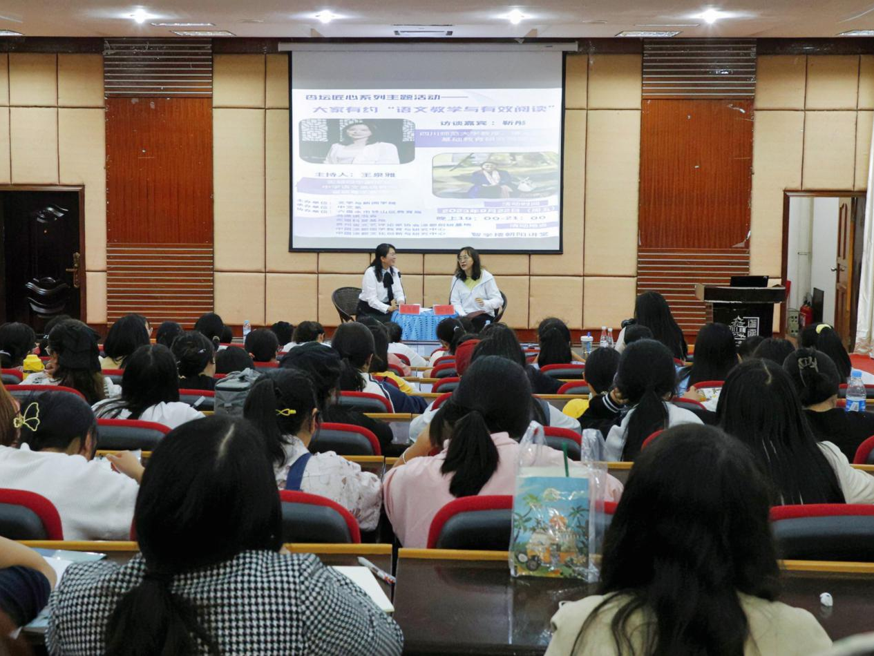 9月22日晚,在学校智学楼朝阳讲堂,四川师范大学教授靳彤以“语文教学与有效阅读”为主题,开展访谈式沙龙。