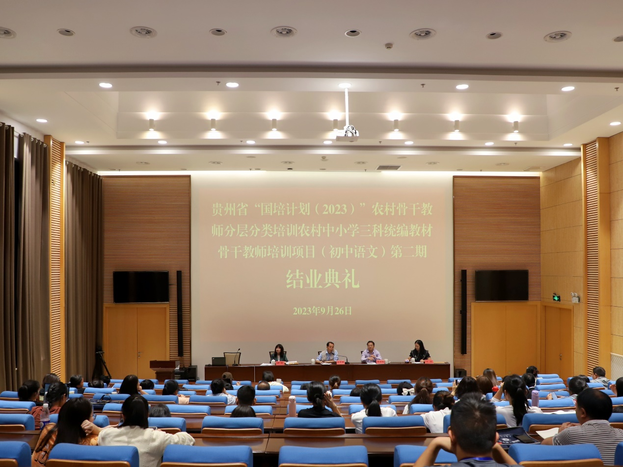 9月26日晚,在学校学术交流中心明道讲堂,贵州省“国培计划(2023)”农村中小学三科统编教材骨干教师培训项目(初中语文)第二期举行结业典礼。文学与新闻学院党委书记龙尚国主持会议,本期培训项目首席专家、文学与新闻学院院长许兴阳,本期培训项目负责人、文学与新闻学院中文系系主任卫佳,汉语言文学专业教师许寻出席典礼。