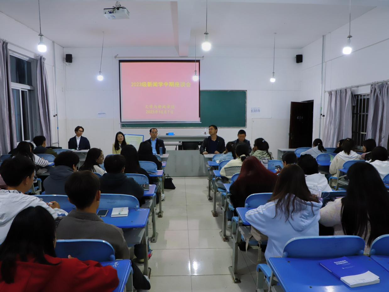 10月7日晚,文学与新闻学院在博学楼414教室召开2023级新闻学中期座谈会。会议由学院党委书记龙尚国主持。学院党委副书记杜云,院长助理、新闻学系主任余索,副系主任吴向华,教师田燕,辅导员何亮出席。