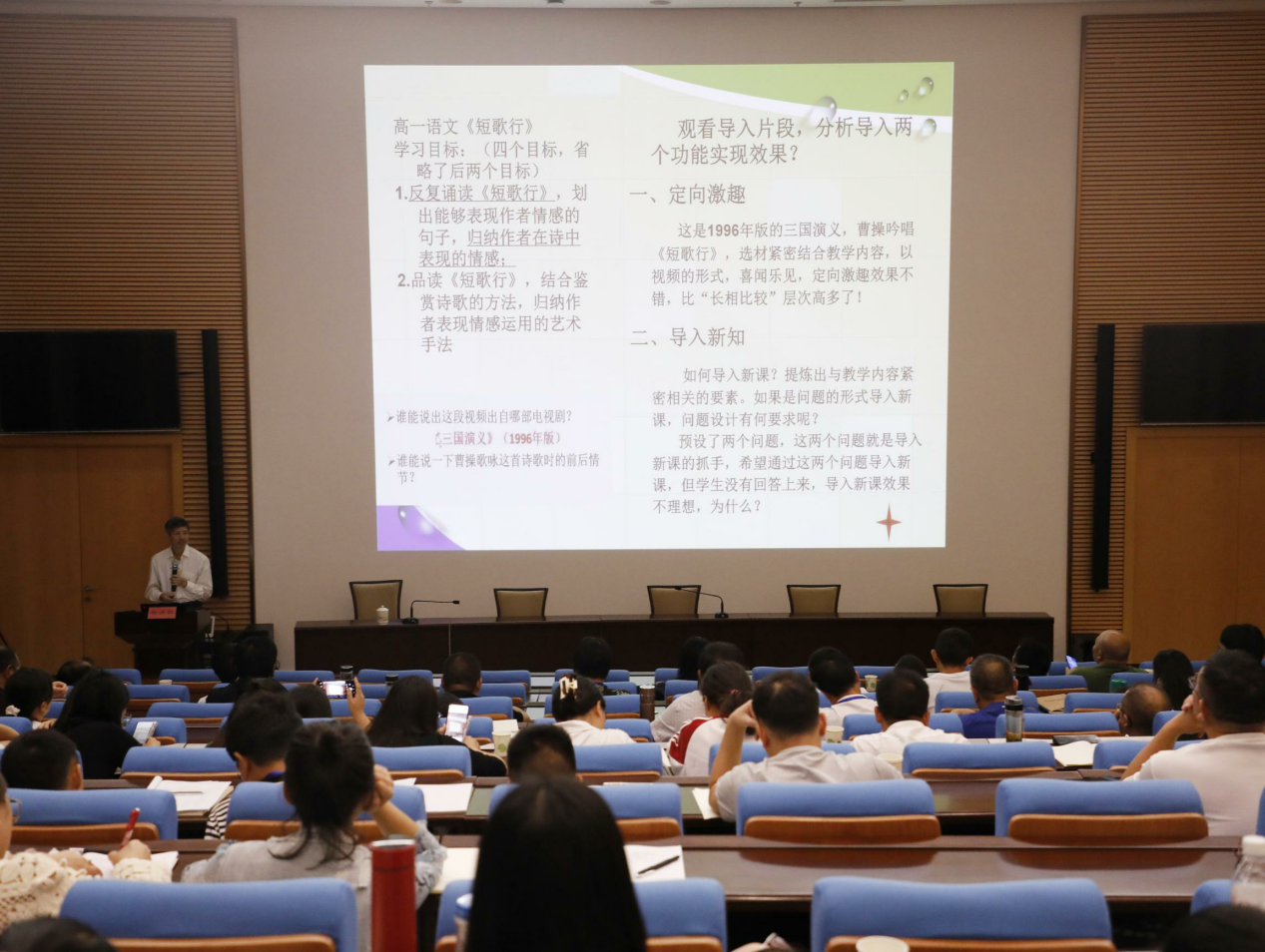 9月9日上午,在学校学术交流中心明道讲堂,由南宁师范大学教育学部专职主任杨进红主讲的“国培计划”专题——“初中语文课堂教学的诊断与改进——语文教师专业发展的有效路径”讲座开讲。讲座由文学与新闻学院主持行政工作的副院长许兴阳主持。