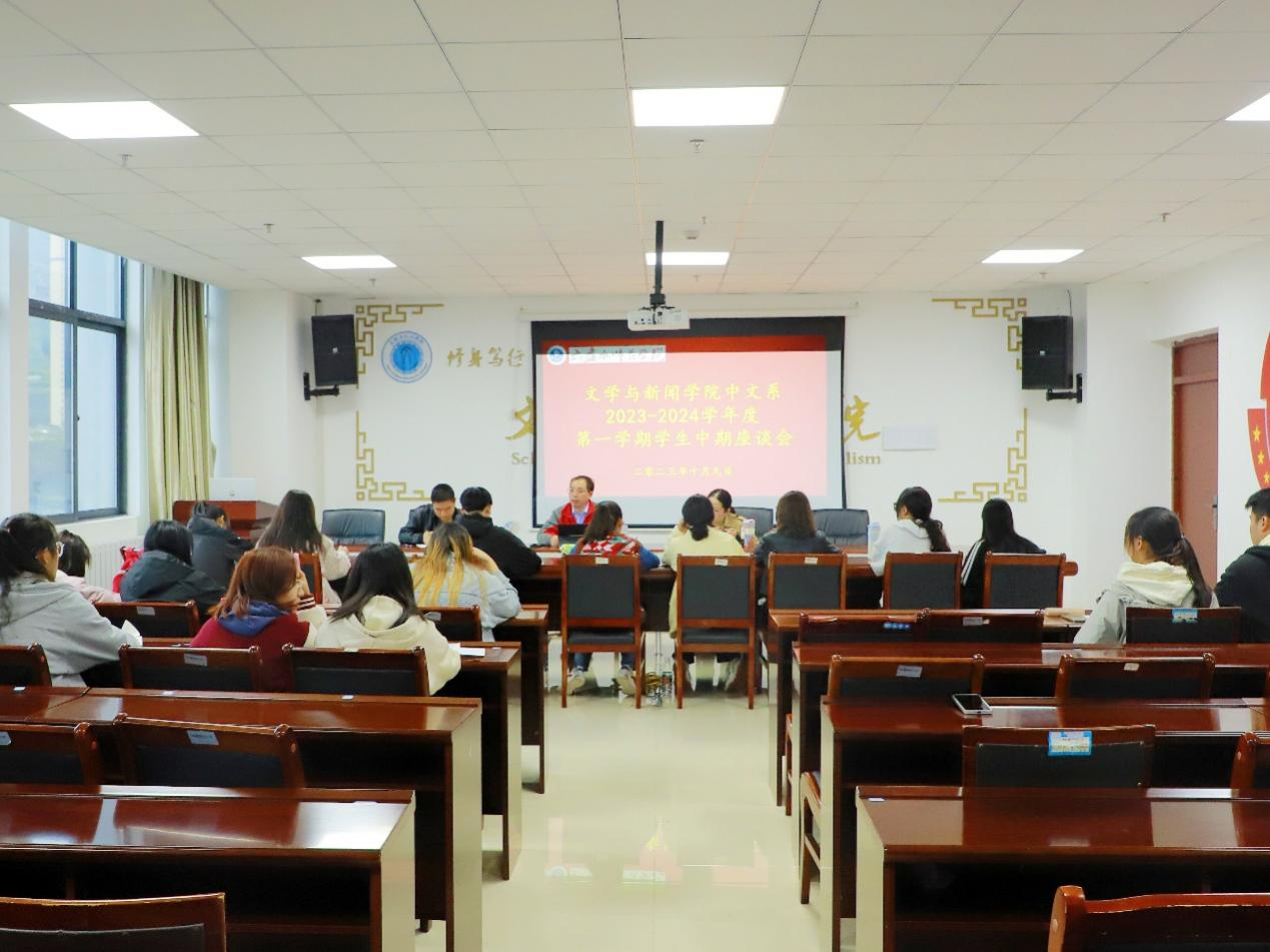 10月9日下午,在奥学楼617会议室,文学与新闻学院召开汉语言文学专业2023-2024学年度第一学期学生中期座谈会。学院党委书记龙尚国、副书记杜云出席。汉语言文学专业系主任卫佳主持会议。