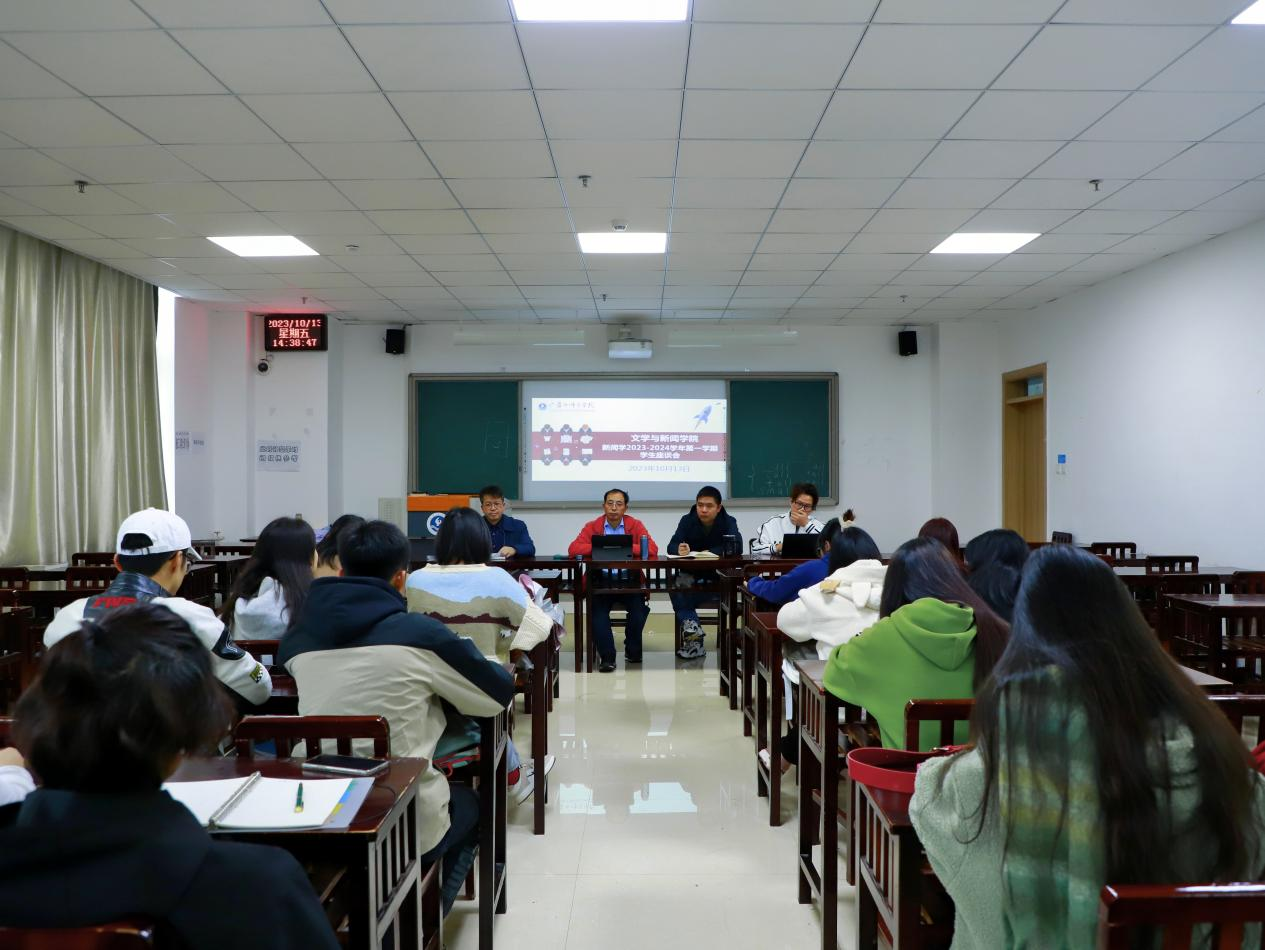 10月13日,文学与新闻学院在奥学楼204召开新闻学专业2023-2024学年度第一学期学生中期座谈会。学院党委书记龙尚国,党委副书记杜云,副教授陈开政出席。新闻学副系主任吴向华主持会议。