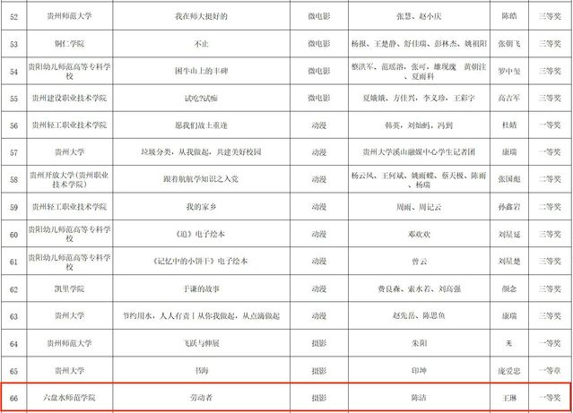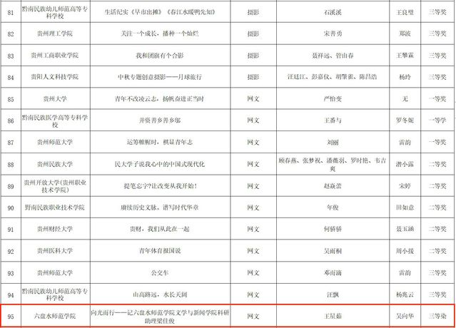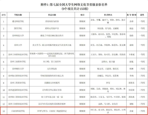 3月8日,贵州省教育厅办公室公布第七届全国大学生网络文化节省级表彰名单。bat365共3件作品获奖,分别是文学与新闻学院新闻学教师王琳指导、陈洁同学创作的摄影作品《劳动者》获省级一等奖;新闻学系主任余索指导、田仁贵、夏玉玲、陈忠美、龚良香、江明洪同学创作的微视频《回望与坚守:六盘水三线建设印记》获省级二等奖;新闻学副系主任吴向华指导、王星茹同学创作的网文《向光而行——记bat365在线中国登录入口文学与新闻学院科研助理梁佳俊》获省级三等奖。