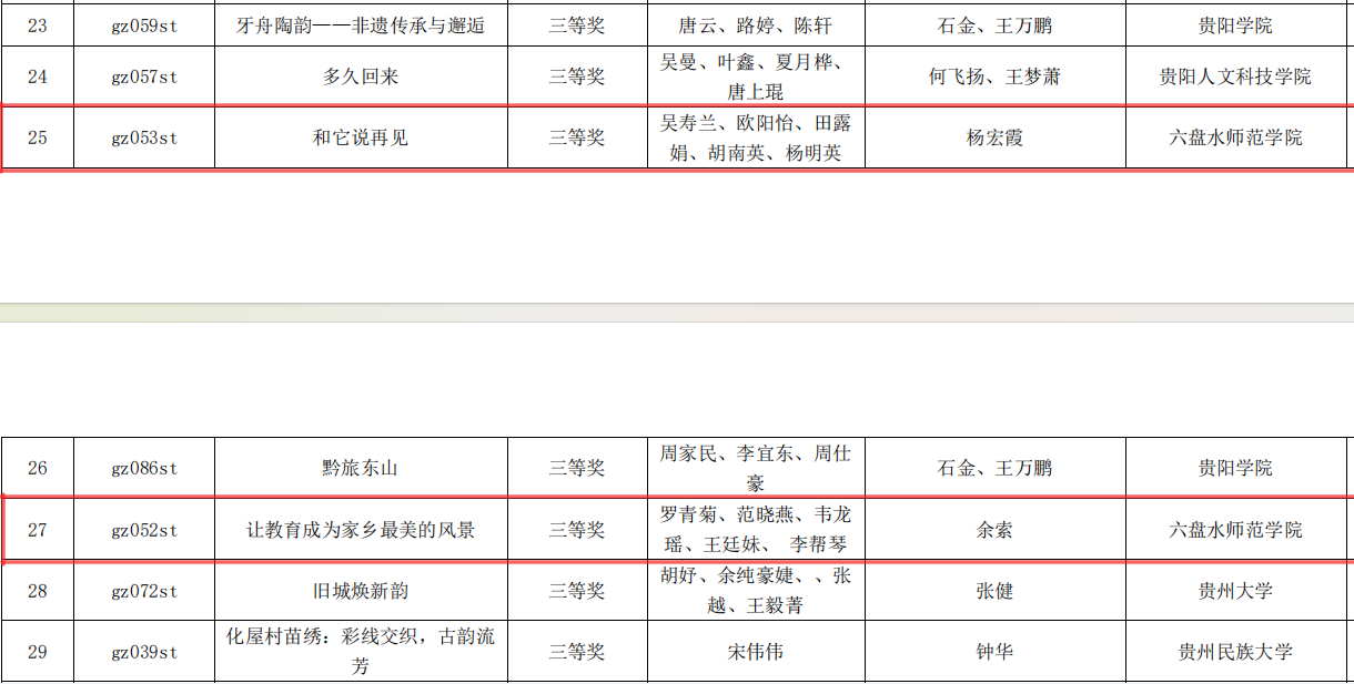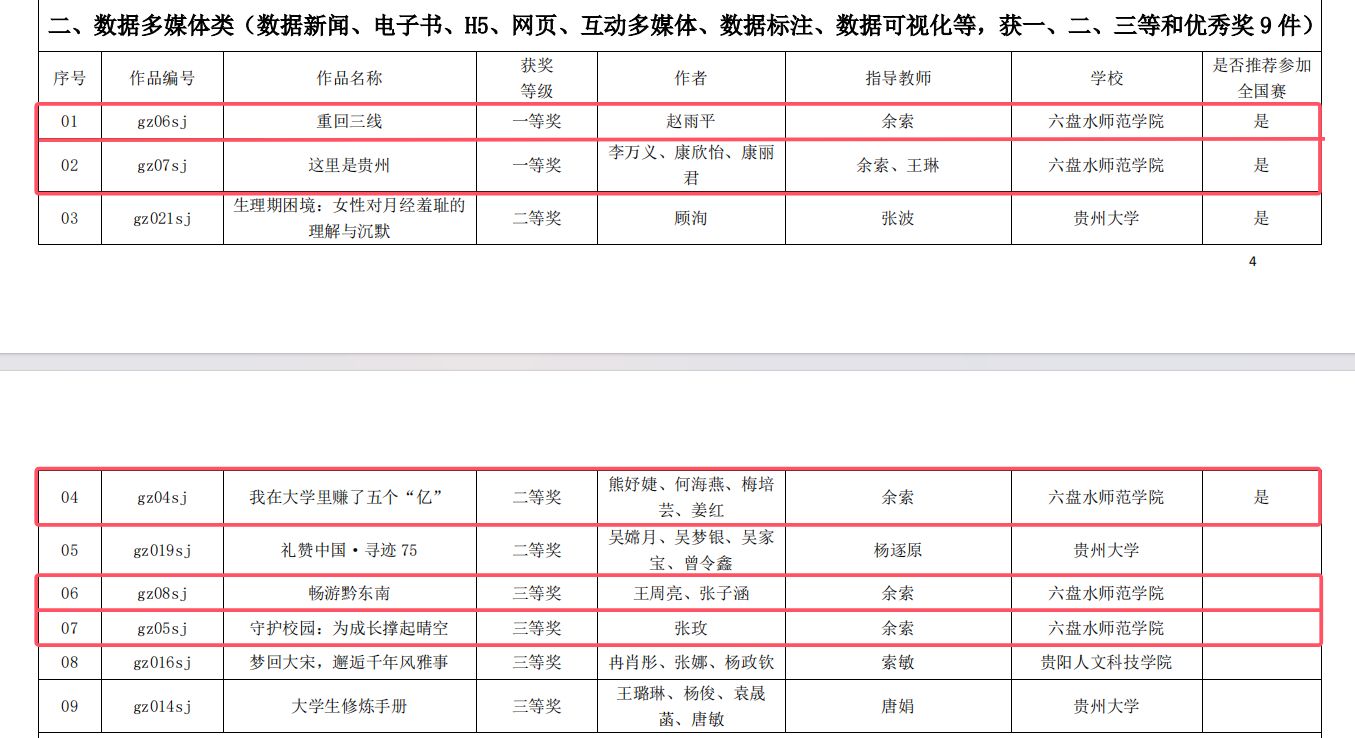 余索老师指导,赵雨平同学创作的《重回三线》;余索、王琳老师指导,李万义、康欣怡、康丽君同学创作的《这里是贵州》,分别获数据多媒体类省级一等奖。