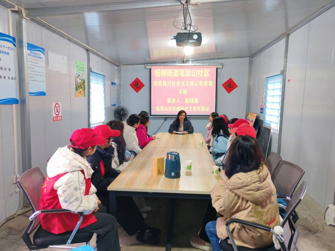 11月23日,文学与新闻学院组织志愿者在杨柳街道笔架山社区新时代文明实践站开展培育践行社会主义核心价值观宣讲活动,笔架山社区工作人员赵晓茜担任宣讲人。