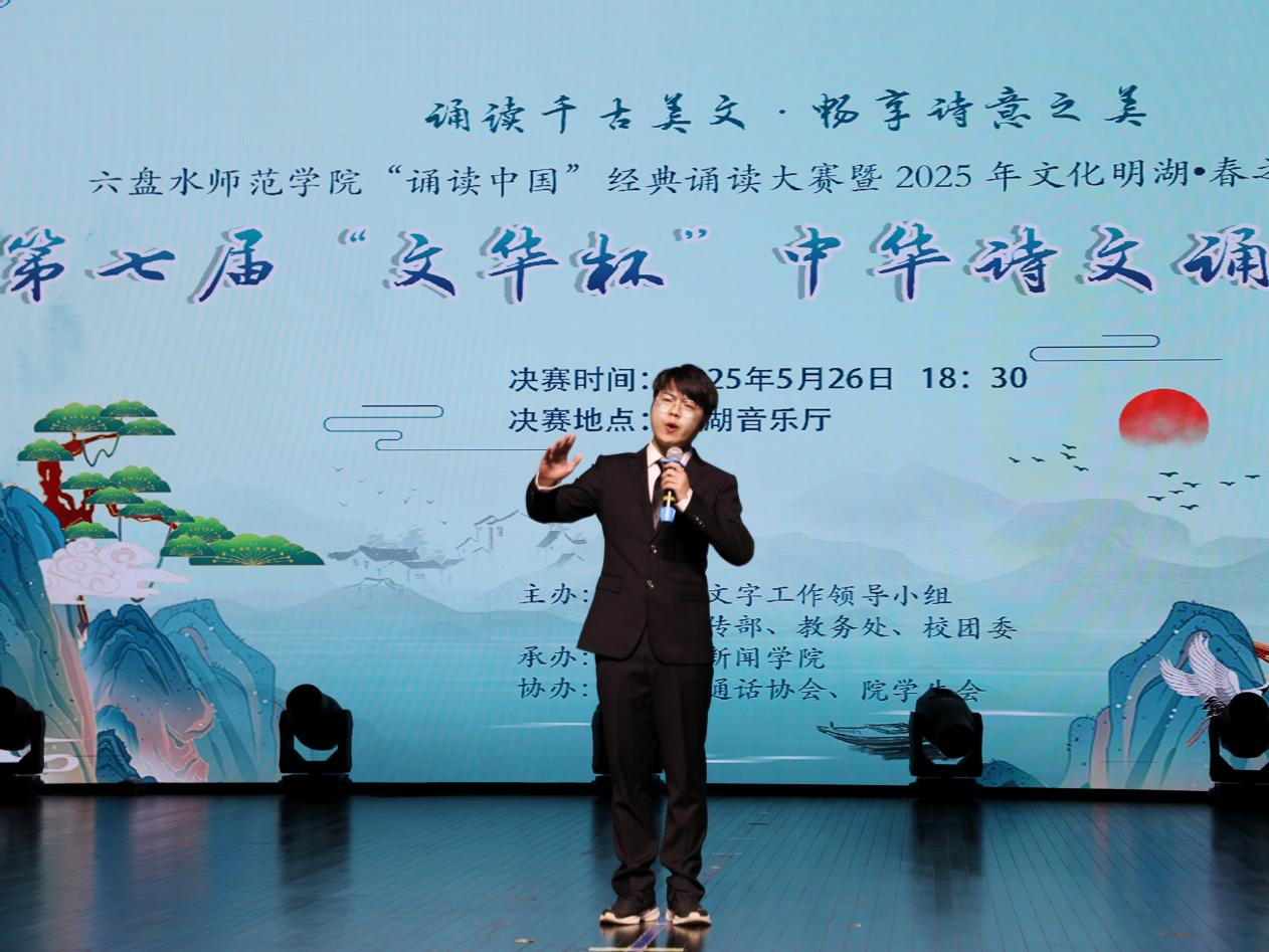 5月26日晚,由文学与新闻学院承办的“诵读中国”经典诵读大赛暨2025年文化明湖•春之声系列活动之第七届“文华杯”中华诗文诵读大赛在学校明湖音乐厅举行。bat365在线中国登录入口副校长费虹、张龙,宣传部部长管迪、教务处处长代稳、校团委书记杨毅,文学与新闻学院党委书记龙尚国、副书记杜云、副院长支媛到场观看。