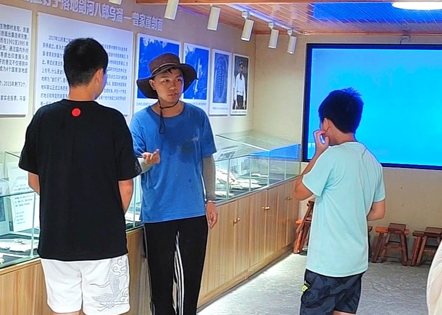 在八郎村陈列馆,科普讲解员刘星宇手持化石标本,正向一个研学团队生动讲解:“这块石板中封印的是5.2亿年前的海洋霸主——宽背虫,也是我们‘金钉子’的标志性化石。”讲解员的另一个身份是八郎村化石守护人刘锋的儿子。在这之前刘星宇考取了导游资格证,他将导游讲解技巧与地质学知识巧妙融合,把深奥的专业术语转化为引人入胜的故事,让观众沉浸于亿年前的海洋世界。