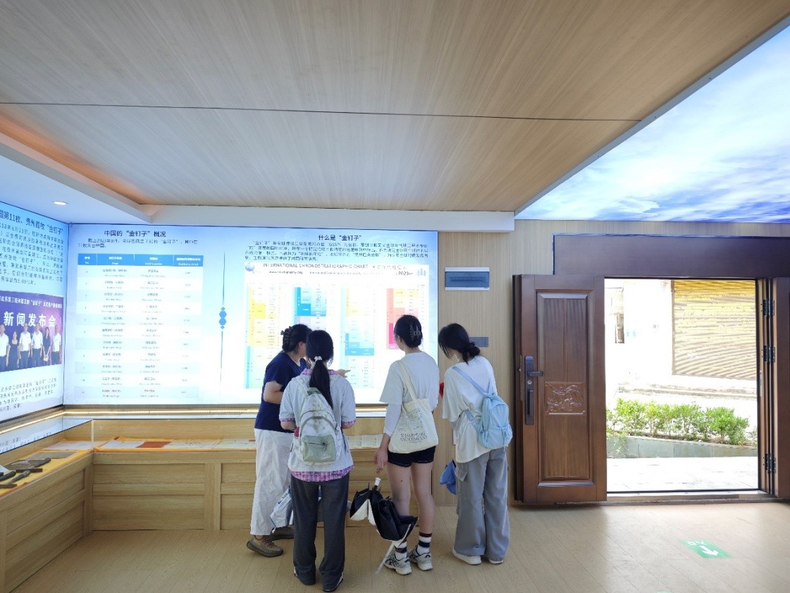 在屯州村古生物化石陈列馆,团队成员采访了村支书张鸿。张鸿介绍,自2018年“金钉子”获得国际认证后,村里基础设施大幅改善,甚至建立了主题广场展示“苗绣化石”系列作品,将苗族非遗技艺与古生物化石形象结合。尽管拥有国际级的化石资源,但旅游发展仍面临专业人才短缺、配套设施不足等挑战,专业讲解员队伍规模小、陈列馆开放不稳定、研学接待体系尚不成熟等问题仍是制约发展的瓶颈。团队成员建议,未来应加强对本地青年人才的培养与支持,推动讲解员队伍专业化、稳定化;同时,继续鼓励“化石拓印”“苗绣化石”等文创开发,促进科普、文旅与非遗深度融合,打造独具特色的IP体系。