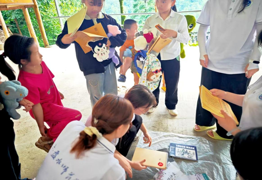 7月10日,团队开展了关爱儿童志愿服务。团队成员前往村民家中把孩子们带到村委会一起玩游戏。在游戏中,成员们不仅添加了有奖问答的方式,还巧妙地将铸牢中华民族共同体意识的相关内容融入其中。当孩子们遇到不会的问题时,团队成员就会用通俗易懂的方式为他们讲解,最后再发放奖品(团队在学校募捐到的物品)。在这个过程中,孩子们不仅收获了快乐,还了解到相关知识。
