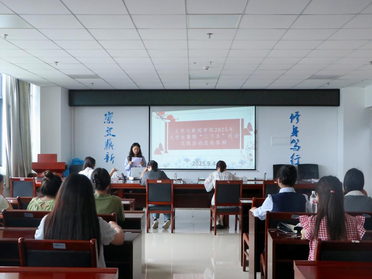 9月4日,文学与新闻学院在奥学楼617会议室举行2025年大学生暑期“三下乡”社会实践活动总结答辩并推报优秀团队和优秀个人到校级参与评选。学生科(团委)辅导员杨杰,中文系主任卫佳,中文系教师徐亚玲,新闻系教师杨宏霞担任评委。